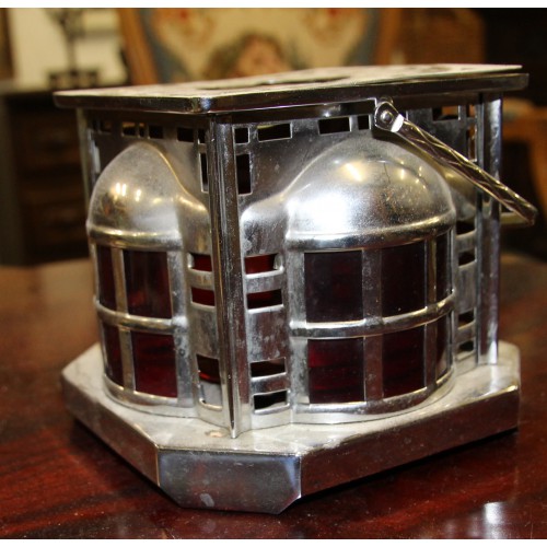 Metaal (1935 20ᵉ) Daalderop-Tiel Theelicht vierzijdige symmetrische haard met rode ruitjes op een achthoekige onder plaat naar bened en gebogen randen. 21 x □ 14,5 cm